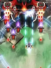The ship is controlled via relative touch and fires automatically when the player touches the screen. The Aura ability needs to be charged by collecting energy from destroyed enemy ships and can be activated by touching the screen with a second finger. The Zen ability is activated by not touching the screen, generally for a short period of time, so the player ship is not able to shoot or move.