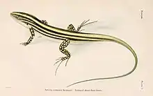 The blue-tailed ground lizard is a moderately sized lizard, with a maximum snout-to-vent length (SVL) of 52.4 mm (2.06 in) for males and 49.9 mm (1.96 in) SVL for females.[6] It is black overall with a creamy white to coppery red stomach. There are 7–9 tan or brown stripes extending from the head to the tail. The tail is one of the most distinctive traits of P. wetmorei. It is a bright turquoise blue or green, the color fully encircling the tail.