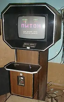 The Photon arcade cabinet was produced in the late 1980s to early 1990s by the eponymous cooperative in Penza.[1] Components were purchased from the plants of Voronezh, Saransk and Nizhny Novgorod. Machines were purchased from the manufacturer "Union" and the Ministry of Culture. The volume of production of automatic machines was up to 150 units per month.[2]