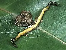 Phrynarachne ceylonica, the bird dung spider, is a species of spiders of the family Thomisidae. It is found in China, Japan, Sri Lanka, Taiwan, and India.[1] The species is known to discharge a foul smell which help it attract prey and deter predators.[2] It both smells like and resembles bird feces, hence the name 'bird dung spider'. The bird dung spider resembles bird feces only when it curls up in response to a predatory threat. It is characteristically known for its dual-purposed ability to mimic the smell and appearance of bird feces to both lure prey and protect against predators.[3] This species of crab spider has a flat, black-brown abdomen with bright yellow legs.[4] The width of the female abdomen is approximately 9.3 mm and the length of the body is approximately 14.5 mm.[4]