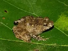 Adult males measure 20–24 mm (0.8–0.9 in) and adult females 30–32 mm (1.2–1.3 in) in snout–vent length. The body is moderately slim. The snout is blunt. The tympanum is distinct. The fingers are blunt, hardly dilated, and have no webbing. The toes are slightly but clearly dilated in discs and are three-quarters webbed. The dorsum is brown-black and uniform or with some large brown-red scapular spots. The hind limbs have brown red bars. The venter is cream. Throat is grey and has a cream-coloured median spot near the chest. The belly bears a small central dark circle, possibly with a white center, which is and surrounded by a complete or incomplete circle touching the chest and groin. Males have a subgular vocal sac, and the gular area may be very dark.[3]