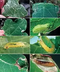 A Leaf mines on a young leaf, arrows pointing at young to middle instar larvae B mature leaf mine with pupal cocoon fold (arrow), white square enclosing early stage mine region C mature sap-feeding larva in pre-cocoon chamber D detailed view of figure C E opened mine showing nearly mature sap-feeding larva in situ F opened young pupal cocoon fold showing cocoon-spinning instar in situ G pupal cocoon fold, arrow pointing to the slender exit H opened pupal cocoon fold showing pupa in situ, dorsolateral view.