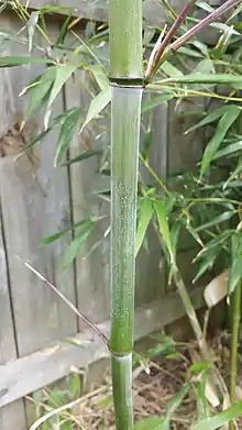 Phyllostachys atrovaginata is a running bamboo with strongly tapered, stiff, upright culms. It may reveal a fragrant scent during warm weather or when vigorously rubbed. [1] The common name of "incense bamboo" comes from the unique aroma. [2] Its culms grow large in diameter relative to height. [3] Maximum height can reach 10 m (33 ft) with a maximum culm diameter of 7.0 cm (2.7 in). [1] This bamboo grows in areas ranging from subtropical to temperate and tolerates winter temperatures down to -23 °C (-10 °F), [1] [2] being a more cold-hardy bamboo. [4] Like water bamboo, the rhizomes and roots of this species also have air canals as an adaptation for living in wet soil. [1][2] The specific epithet atrovaginata or "dark-sheathed" is inspired from the dark green and deep red wine colors of the culm sheaths. [1] P. atrovaginata has formerly been called Phyllostachys congesta. [1] [5]