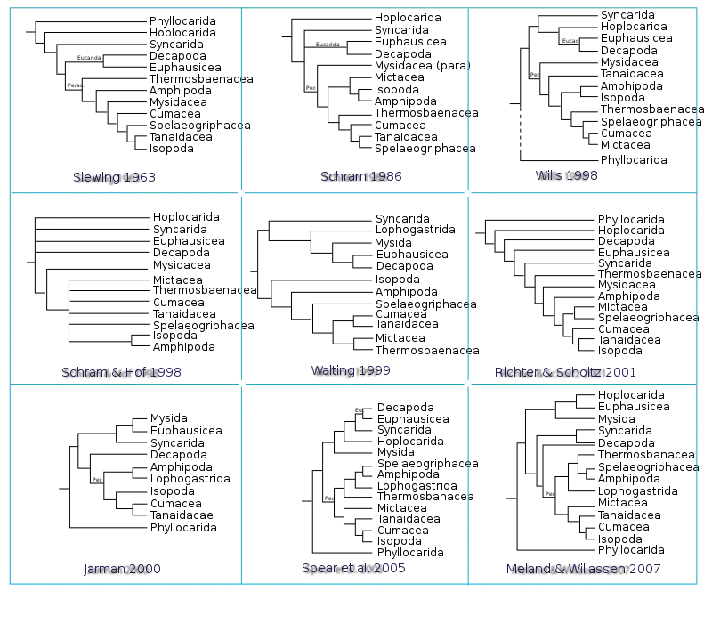 Molecular studies by Jarman et al. (2000),[2] Spears et al. (2005)[3] and Meland & Willassen (2007)[4] (which was derived from Spears et al. (2005) by adding 22 mysidacean taxa to those 26 taxa) suggest a phylogeny with some elements similar to that proposed by Richter & Scholtz (2001),[9] but disprove the monophyly of both the Edriophthalma and the Mysidacea and do not possess a basal eumalacostracan taxa or a basal peracarid taxa (the Hoplocarida and the Syncarida, respectively in [9]): The Amphipoda (with Spleogriphacea) form a clade with the Lophogastrida, the Isopoda are in a derived clade with the Cumacea and Tanaidacea, while most importantly the Mysida in all three analyses falls basal to the non-Peracarida subtree,[2][3][4] which however has a limited morphological support (Poore, 2005).