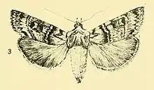 Expanse. 28 to 30 lines. Antennae ferruginous-grey, filiform. Legs, palpi, head, and thorax grey irrorated with ferruginous. A dark mark across front of thoracic crest. Crests strong. Abdomen greyish-ochreous, lighter in colour towards anal tuft, which is light ochreous-grey. Forewings grey, markings ferruginous. Reniform and orbicular grey out-lined with ferruginous. Base of wing light grey, followed by a dark jagged transverse line. A double jagged transverse line at 14 across wing. A suffused patch around reniform, continuing as a well-defined jagged line with a faint line on each side to dorsum. A rather indistinct suffused line near termen. Cilia grey. Hindwings uniform dark-grey. Cilia silvery-grey with a dark-grey line at base.[2]
