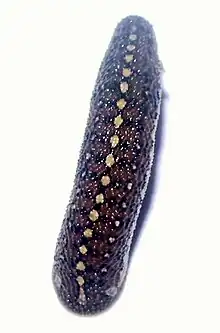 Phytobdella catenifera is a large (5-cm long) terrestrial leech found in Peninsular Malaysia.[1] John Percy Moore[2] chose this species’ epithet ‘catenifera’ after the striking chain-striped pattern on the creature's back (Latin catena = chain).