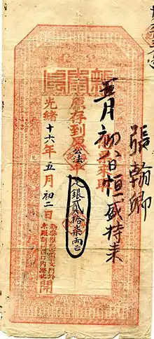 Some piaohao issued their own paper bills, which were known as duitie (兌帖), qitie (期帖), qiantie (錢帖), and yinpiao (銀票), with different functions (many of these banknotes represented letters of exchange).[3] These banknotes were seen as "making good for the missing of a kind of paper money or paper currency in the monetary system of the (early) Qing dynasty period", as well as for the failed Great Qing Treasure Note and Hubu Guanpiao banknotes issued during the reign of the Xianfeng Emperor.[3]