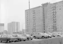 In the 1970s, Piaski began being developed as a residential neighbourhood. Between 1970 and 1973, the multifamily residential apartment buildings were built around the Broniewskiego Street.[8] The major development began in 1978, with the construction of the first apartment buildings around Zegrzyńska Street. In the early 1980s, the architect Józef Zbigniew Polak had designed the apparent complex at Sybiraków Avenue, to form the shape of four stars, the symbol of the general of the army of the Polish Armed Forces. It was done to honour general Wojciech Jaruzelski, who at the time was the Prime Minister of Poland and the commander-in-chief of the Polish Armed Forces.[5]