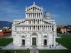 The Piazza dei Miracoli (Italian: [ˈpjattsa dei miˈraːkoli]; 'Square of Miracles'), formally known as Piazza del Duomo ('Cathedral Square'), is a walled 8.87-hectare (21.9-acre) compound in central Pisa, Tuscany, Italy, recognized as an important center of European medieval art and one of the finest architectural complexes in the world.[1] It was all owned by the Catholic Church and is dominated by four great religious edifices: Pisa Cathedral, the Pisa Baptistery, the Leaning Tower of Pisa (the cathedral's campanile or bell tower), and the Camposanto Monumentale ('Monumental Cemetery'). Partly paved and partly grassed, the Piazza dei Miracoli is also the site of the Ospedale Nuovo di Santo Spirito ('New Hospital of the Holy Spirit'), which now houses the Sinopias Museum (Museo delle Sinopie) and the Cathedral Museum (Museo dell'Opera del Duomo).