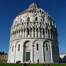 The Baptistery, dedicated to St. John the Baptist, stands opposite the west end of the Duomo. The round Romanesque building was begun in the mid 12th century: 1153 Mense August fundata fuit haec ("In the month of August 1153 was set up here..."). It was built in Romanesque style by an architect known as Diotisalvi ("God Save You"), who worked also in the church of the Holy Sepulchre in the city. His name is mentioned on a pillar inside, as Diotosalvi magister. the construction was not, however, finished until the 14th century, when the loggia, the top storey and the dome were added in Gothic style by Nicola Pisano and Giovanni Pisano.