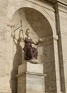 Its double ramp of stairs was designed by Michelangelo. This double stairway to the palazzo replaced the old flight of steps and two-storied loggia, which had stood on the right side of the palazzo. The staircase cannot be seen solely in terms of the building to which it belongs but must be set in the context of the piazza as a whole.[6] The steps, beginning at the center of each wing, move gently upward until they reach the inner corner, level off and recede to the main surface of the façade. They then continue an unbroken stateliness toward each other, converging on the central doorway of the second story.[5] This interruption of the diagonal line and the brief inward change of direction both absorbs the central axis and links the two sides. The fountain in front of the staircase features the river gods of the Tiber and the Nile as well as Dea Roma. The upper part of the facade was designed by Michelangelo with colossal corinthian pilasters matching with the two other buildings. Its bell-tower was designed by Martino Longhi the Elder and built between 1578 and 1582. Its current facade was built by Giacomo della Porta and Girolamo Rainaldi.[13] Porta did the completion of the façade of the Palazzo Senatorio, including the positioning, in the central niche, of a statue of Athena taken from the Palazzo dei Conservatori, which in 1593. was replaced with another statue of Athena much smaller, in red porphyry and white marble.