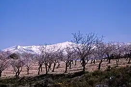 ![]() View of the Pico del Caballo behind almond trees | |