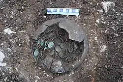 The hoard was found by metal detectorist Brian Read in 2016.[2] It was lifted up with the block of soil in which it was buried and taken to the British Museum for study.[3]