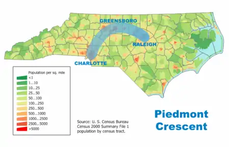 The Piedmont Crescent, also known as the Piedmont Urban Crescent, is a large, polycentric urbanized region in the U.S. state of North Carolina that forms the northern section of the rapidly developing Piedmont Atlantic megalopolis (or "megaregion"), a conurbation also known as the "I-85 Boombelt", which extends from the Raleigh area in North Carolina, southwards to Atlanta, Georgia in the southeastern United States.[1]
