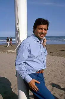 In 1997, Chiambretti was chosen as one of the presenters of the 47th Sanremo Music Festival, along with Mike Bongiorno and Valeria Marini.[4] During the following year, he presented the DopoFestival, a show aired immediately after each night of the Sanremo Music Festival, featuring comments about the televised song contest.[5] In 2002, he created a new TV show, Chiambretti c'è, together with Gianni Boncompagni.[1] After being excluded from RAI, Chiambretti, assisted by the showgirl Sylvie Lubamba, presented the show Markette – tutto fa brodo in tv on the channel La7.[1] After returning to the DopoFestival in 2007, he presented the Sanremo Music Festival once again in 2008, with Pippo Baudo.[6][7]
