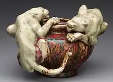 His shapes were often sculptural, either in their broad shape, or sometimes incorporating figures modelled by sculptors he collaborated with.[4] The Symbolist sculptor Alphonse Voisin-Delacroix (1857–1893) was one collaborator until his early death.[5] Like some other Art Nouveau potters Dalpayrat often made pieces to be mounted with metal elements by metalworking firms, including one lamp base designed with a glass and metal shade by Tiffany Studios of New York. This marriage was very likely arranged by Siegfried Bing, whose Paris gallery Maison de l'Art Nouveau sold works by both makers.[6] An inkwell with bronze mounts, also in the Metropolitan Museum of Art, has the metal marked by Edward Colonna, a regular designer in metal for Bing.[7]