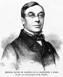 In 1840, Dietsch had become chorus master at the Paris Opéra on Rossini's recommendation.[3] He took over from Girard as conductor in 1860, but nonetheless could not avoid run-ins with the greatest composers of his day: Wagner blamed the fiasco of the Paris Opéra premiere of Tannhäuser (1861) on the conductor (perhaps unjustly, as Wagner had been closely involved in the opera's 164 rehearsals), and in 1863 Dietsch resigned over a dispute with Verdi in the midst of rehearsals for Verdi's Les Vêpres siciliennes.[1]