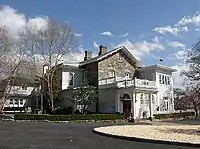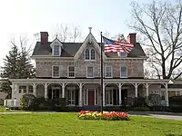 In 1749, Pierre turned the family's simple hunting lodge into an elegant residence known as Van Cortlandt Manor House, adding the upper stories and porches. The house remained in the Van Cortlandt family until 1945 and was purchased in 1953 by John D. Rockefeller Jr. to assure its preservation.[19] The restored manor house was designated as a National Historic Landmark in 1961.[20][21] During the American Revolutionary War Pierre entertained numerous famous Generals, such as Washington, Lafayette, Rochambeau, and von Steuben at the Manor House, as well as other promonent citizens, such as Franklin; when the place was threatened by the British Army in New York, he removed his wife and children to one of the Livingston farms at Rhinebeck, and for a time the Upper Manor House at Peekskill.[22]