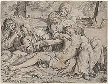 In the last version, the composition changed; it looks more like the final painting: the body of Christ is placed so his shoulders and legs are in Marie's lap, which creates an intimate link between them in a way reminiscent of Michelangelo's Pietà.[2] Marie is, however, seated on the earth (and not on a throne, as in the Vatican statue), and Jesus' legs are on the ground and stretched over a shroud. Those elements are shared with the Lamentation of Correggio. Carracci had studied that work as a young man. He had even revisited that the work only a little before the Farnese commission, which resulted in an engraving Pietà di Caprarola.