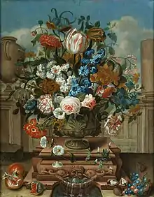 Flemish still life painting at the end of the 17th century showed a preference for decorative effect over naturalistic representation.[11][12] The trend was initiated by contemporary Flemish artists Jan Baptist Bosschaert and Gaspar Peeter Verbruggen the Younger and was also followed by Pieter's brother Simon as well as Pieter Casteels III. Hardimé created many works showing flower bouquets in large stone vases or arranged in the form of garlands around vases or garden ornaments. The vases were often depicted in outdoor settings with figures.[11] After Mattheus Terwesten's regular collaborator Gaspar Peeter Verbruggen the Younger left The Hague in 1732, Pieter Hardimé and Terwesten worked together on decorative projects catering to the taste of the wealthy citizens of The Hague.[13]