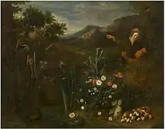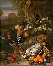 His still lifes include outdoor settings with dead game and forest floors and indoor compositions with a profusion of small objects, fruits, single blossoms, nuts and other objects scattered across a surface.[10]