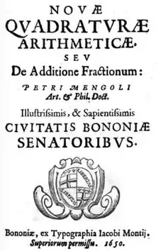 Mengoli was pivotal figure in the development of calculus.[1] He established the divergence of the harmonic series nearly forty years before Jacob Bernoulli, to whom the discovery is generally attributed; he gave a development in series of logarithms thirteen years before Nicholas Mercator published his famous treatise Logarithmotechnia.[2] Mengoli also gave a definition of the definite integral which is not substantially different from that given more than a century later by Augustin-Louis Cauchy.[1]