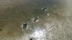 The black mud of Pikrolimni used in pelotherapy (seen with footprints of local wildlife)