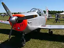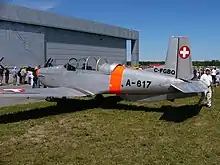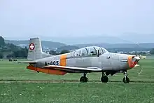 The first prototype P-3.01 was built in 1953 and flew on 3 September the same year[2] with a two-blade propeller. The power of the engine of the aircraft proved to be insufficient. A second prototype to become the military prototype flew in August, 1954, now equipped with a different engine and a three blade propeller. During the evaluation of the military prototype, now designated P-3.02 (HB-HOO, becoming A-801 in January 1956), the aircraft had to perform against a T-34 Mentor that had been brought to Switzerland.[3] The test pilot at the demonstration flight went to the limits and flew a standing "8", knowing, the Mentor would not be able to fly this manoeuvre.[4] After the acceptance by the Swiss Air Force, the service received a pre-series of 12 aircraft type P-3.03 (A-802-A-813). Six additional examples were built and flew with civilian markings, those P-3.04 were later acquired by the Brazilian Navy.[5] The Swiss Air Force then purchased 60 airframes of the type P-3.05 (A-814-A-873)[6] and used their P-3s as a training aircraft until 1983, although it continued to be used as a liaison aircraft for another decade. In 1993–1995, 65 ex-Swiss Air Force aircraft were sold on the private market.[7]