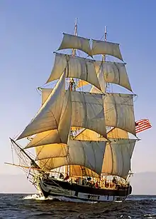 A replica of the vessel was based in Dana Point, California, the site of some of Dana's adventures. This replica began as a 3-masted schooner (also called a "tern" schooner in North America) built in 1945 for the Baltic trade in Denmark. In 1975, Pilgrim was converted to a brig in Setúbal, Portugal. She was used as a floating classroom with the Ocean Institute in Dana Point, California, and she set sail every summer on a tour of Southern California with a volunteer crew.[2] The ship was used in Amistad, a film directed by Steven Spielberg. Pilgrim also played the notorious "Ghost Galleon" in Power Rangers: Turbo.