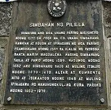 The Diocesan Shrine and Parish of St. Mary Magdalene (Filipino: Pangdiyosesis na Dambana at Parokya ni Santa Maria Magdalena and Simbahan ng Pililla), also known as Pililla Church, is a Roman Catholic church located in the municipality of Pillila, Province of Rizal, Philippines. The church was built by the Franciscans in 1583, under the patronage of Saint Mary Magdalene. It is a few kilometers away from San Ildefonso Parish Church, a historical church in Tanay.