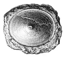 | Drawing of dorsal view of the shell of Pilina solarium. Head region is (probably) on the left. | |