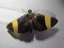 The wingspan is about 42 mm. The wings are black-brown with a purplish gloss, the forewings with a broad straight oblique yellow band from the costa just beyond the middle to the termen from vein 2 to the tornus.[3]