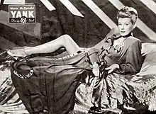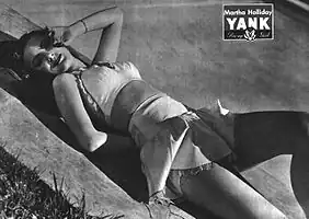 Other famous actresses featured as Yank pin-ups included Lauren Bacall (November 1944), Ava Gardner (September 1943), Ingrid Bergman (April 1944 and March 1945), Gene Tierney (February 1944 and March 1945), Jane Russell (January 1943, March 1943 (credited as "The Best-known Eyes in the Army"), and September 1945), Susan Hayward (October 1945), Donna Reed (April 1943 and November 1945), and Lucille Ball (July 1943 and March 1945). The women included as Yank pin-ups included at least two African-Americans: pianist and singer Hazel Scott (March 1943) and singer/actress Lena Horne (July 1943).[8][9] A few women appeared three times as Yank pin-ups. They included actresses Ramsay Ames, Dusty Anderson, Anne Gwynne, Dolores Moran, and Jane Russell, big-band singer Janet Blair, and swimming champion and actress Esther Williams.[6][7][10]
