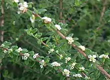 It is a loose, spreading shrub with many branches up to 2 m high, with mature trunks of 5–10 cm diameter.[2] The leaves are aromatic, simple, opposite (or fascicled), elliptic to obovate or spatulate, 5–10 mm long, with revolute margins. The flowerheads are axillary, sessile, few-flowered, with a strigose calyx; the corolla is whitish, about 2 mm long, four-lobed, and with four stamens.[3] The fragrant foliage and tiny white flowers are highly attractive to pollinators, in particular the Atala butterfly.[2][4]