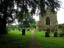 St Lawrence's Church in Broughton is a 14th-century church with a 15th-century tower. A series of wall paintings covering large parts of the north and south walls, discovered during an 1849 restoration, is the chief interest of the church. The paintings include a 14th-century Pietà, a Doom, St Helena and St Eligius, and St George slaying the Dragon.[4][11]