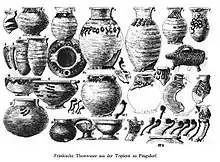 Controversially discussed is the classification of an in 1949 found canteen from Zelzate, which was burrowed together with a Carolingian coin hoard.[4] Within the literature this find is usually referred to be the oldest dated vessel of the Pingsdorf Ware range. By now the canteen of Zelzate is attributed to the painted Carolingian pottery of the Baldorf type.[5] In general, a coin hoard vessel from Wermelskirchen,[6] dating to 960, is referred to be the oldest vessel of the Pingsdorf Ware with an absolute date.