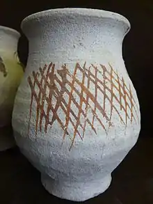Within its nearly 400-years of existence in which Pingsdorf ware was produced, the variety of ceramic types did not experience any considerable change. Until now there are only a few stratified finds which could ascertain a detailed chronology. Nevertheless, in general a development form pale vessels with a smooth surface to more high fired, darker serrated vessels is noticeable, which are displaced by vessels with clearly more carved out external rotational grooves. This change to serrated types was conducted during the late 12th century. Until now a periodic change could not be proven only on foundation of its painting. Red patterns of brush strokes are evident within all periods of Pingsdorf ware. Patterns of grids are by tendency a development of the 12th century onwards.[2] The red painting is gradually abandoned during the late period on the end of the 12th century.[3]