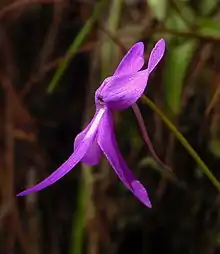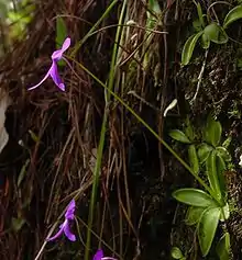 Pinguicula orchidioides /pɪŋˈɡwɪkjʊlə ɔːrkɪdiˈɔɪdiːz/ is a perennial rosette-forming insectivorous herb native to Mexico and Guatemala.[1] A species of butterwort, it forms summer rosettes of flat, succulent leaves up to 5 centimeters (2 in) long, which are covered in mucilaginous (sticky) glands that attract, trap, and digest arthropod prey. Nutrients derived from the prey are used to supplement the nutrient-poor substrate that the plant grows in. Uniquely among Pinguicula species from the Americas, p. orchidioides produces gemma-like basal buds which elongate into stolons and serve as a means of asexual reproduction. In the winter the plant forms a non-carnivorous rosette of small, fleshy leaves that conserves energy while food and moisture supplies are low. Single purple flowers appear between July and September on upright stalks up to 22 centimeters long.