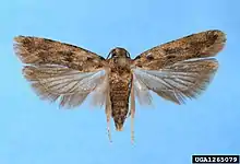 The pink bollworm (Pectinophora gossypiella; Spanish: lagarta rosada) is an insect known for being a pest in cotton farming. The adult is a small, thin, gray moth with fringed wings. The larva is a dull white caterpillar with eight pairs of legs[1] with conspicuous pink banding along its dorsum. The larva reaches one half inch in length.