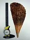 The amber pen shell may reach 30 cm (12 in) in length [6] with shell growth being extremely rapid after settlement [up to 2.2 mm (0.087 in) in length/day] and growth slowing down as shells get large and attain a refuge in size [at around 15 cm (5.9 in)].[7] The exposed valves of amber penshells are subject to frequent damage as they often show breaks and scars. While its half-buried position facilitates filtering water from above silty bottoms, it also increases exposure to predators. Octopuses are likely important predators of amber pen shells.[9]