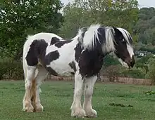 Clydesdales, some Gypsy horses, some Arabians, and some American Paint Horses have a pattern of sabino inheritance that is more consistent with a polygenetic mode than a single allele. The resulting patterns are easily confusable with sabino horses caused by sabino-1 or dominant white alleles and are illustrated in Figure 7.28. In some families, horses produce obviously patterned sabino foals roughly in proportion to their own degree of whiteness. This is consistent with a polygenetic mode of inheritance, and the lack of the sabino-1 allele in these breeds points to a potentially independent genetic mechanism leading to the sabinos in these breeds. - 1 2 Ludwig, Arne; Pruvost, Melanie; Reissmann, Monika; Benecke, Norbert; Brockmann, Gudrun A.; Castaños, Pedro; Cieslak, Michael; Lippold, Sebastian; Llorente, Laura; Malaspinas, Anna-Sapfo; Stalkin, Montgomery; Hofreiter, Michael (2009). "Coat Color Variation at the Beginning of Horse Domestication". Science. 324 (5926): 485. Bibcode:2009Sci...324..485L. doi:10.1126/science.1172750. PMC 5102060. PMID 19390039.