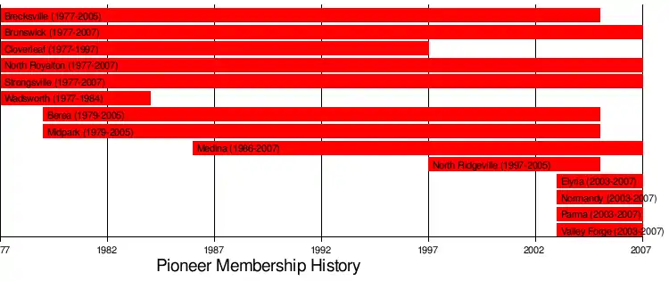 The Pioneer Conference was a high school athletics conference in northeastern Ohio. It was founded in 1977. It disbanded after the 2006–2007 school year. The schools joined and help create the Northeast Ohio Conference. The Pioneer Conference was formed in 1977 with six original members: Brecksville, Brunswick, Cloverleaf, North Royalton, Strongsville and Wadsworth. These schools had similar challenges in the late 1970s. They were outgrowing their conference opponents they left behind when the league formed; the Chippewa conference (Orrville, Triway and West Holmes) and the Cuyahoga County Conference (Cuyahoga Hts, Brooklyn, Independence). Their communities were also easily accessible from I-71, I-76 and I-271 (and their school districts grew rapidly as a result of that). In recent years Cloverleaf is the only school that has seen a continued decline in school size. Two high schools in the Berea City School District — Berea and Midpark — joined in 1979. These two schools were also part of the growing I-71 corridor of the late 1970s. Wadsworth left in 1984 for the Suburban League and was replaced by Medina two years later.[1] North Ridgeville replaced Cloverleaf, which left to join the Suburban League in 1997.