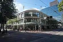 Pioneer Place is an upscale, urban shopping mall in downtown Portland, Oregon. It consists of four blocks of retail, dining, parking, and an office tower named Pioneer Tower. The mall itself is spread out between four buildings, interconnected by skywalks or underground mall sections. The footprint of the entire complex consists of four full city blocks, bisected by SW Yamhill and Fourth, bounded north-south by SW Morrison and Taylor Streets and east-west by SW Third and Fifth Avenues.[2] In 2014, Pioneer Place was the third-highest selling mall in the United States based on sales per square foot, sitting just behind Bal Harbour Shops and The Grove at Farmers Market.[3]