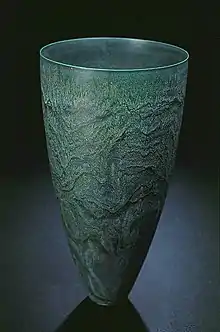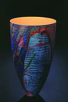 This glaze and lustre period reached its apogee in the Pakistan series, where multiple, liberal layers of glaze were followed each time by dousing in paraffin wax, scraping back, and filling.[4]