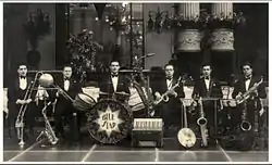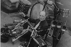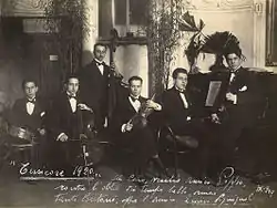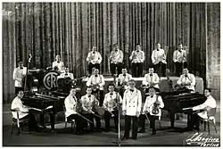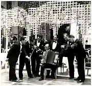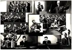The Orchestra had two fixed members, Gianni Miglio and Luigi Balma, and included many others. Pippo played nine instruments and selected the members of his orchestra with a simple rule: each member must play at least three instruments, read music and play a wide list of songs from memory. The band soon held seven musicians, who played 36 instruments including the mellophone. “Pics of this time show a group of seven performers and all around a huge scenery of instruments, in one of these you can count at least 26: almost four each! It must have been an astonishing show to see them!”.[4]