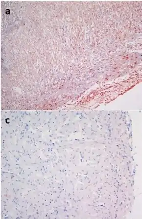 Histopathological assay of PRV (red) in Norwegian farmed Atlantic Salmon heart tissue (blue): a) Salmon exhibiting heart and skeletal muscle inflammation (HSMI) c) Healthy salmon.