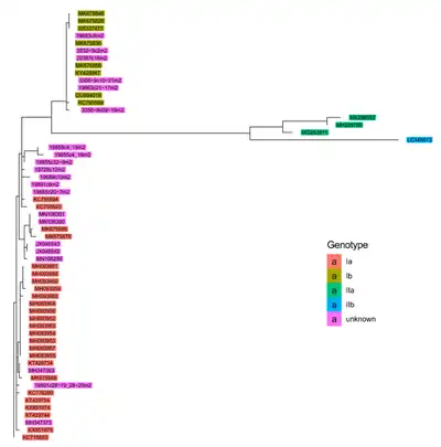 Genotype II was first discovered when comparing the S1 sequences among farmed Atlantic salmon in Chile, and further reiterated with both M2 and whole genome analysis.[21][17] Despite being within one genotype, the sub genotypes IIa and IIb exhibit much higher inter-sequence diversity than do Ia and Ib.
