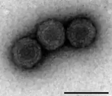 As a member of genus Orthoreovirus, the virion form of PRV is a non-enveloped icosahedral capsid with two layers, the outer and core. The diameter of the total virion encompassing the outer layer is approximately 70 nm, with the inner core layer measuring around 39 nm in diameter.[24]