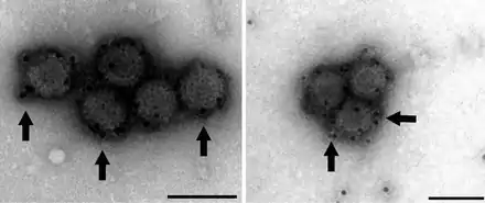 Electrogram image of PRV with immunogold labelled proteins in black arrows. Left: Viral attachment protein (σ1) on outer capsid. Right: Outer clamp protein (σ3) on outer capsid.