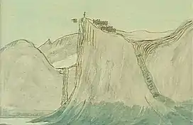 An Inuk and a Viking are said to have climbed to the summit and held a shooting competition with bow and arrow on a seal pelt, stretched on a bank of the fjord. The Inuk won and pushed the loser off the cliff to his death, per the terms of the Viking's agreement.[1][2]